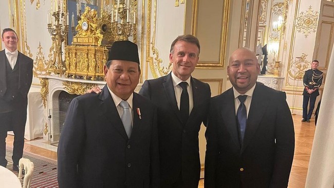 Presiden RI terpilih, Prabowo Subianto, mengunggah foto bersama dengan Presiden Prancis, Emmanuel Macron, dan putranya Didit Hediprasetyo. Unggahan Prabowo itu menggunakan keterangan Bahasa Prancis.