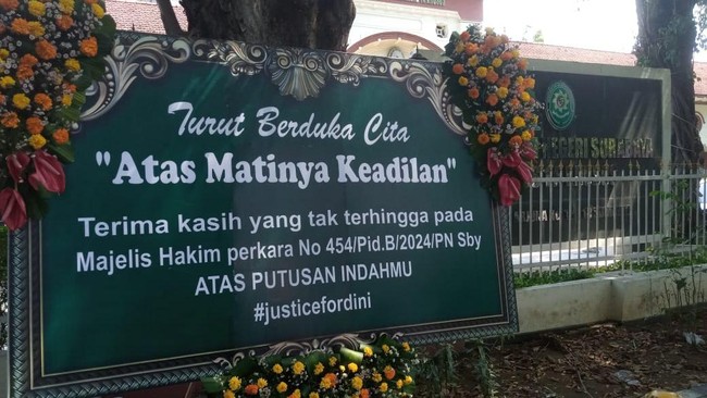 "Turut Berduka Cita atas Matinya Keadilan, Terimakasih yang tak terhingga pada Majelis Hakim perkara no.454/Pid.B/2024 PN Sby atas Putusan Indahmu #justicefordini," demikian tulisan karangan bunga yang diletakkan di depan pagar PN Surabaya.