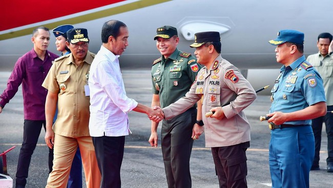Berdasarkan keterangan Biro Sekretariat Presiden, Jokowi telah Pangkalan TNI AD Ahmad Yani, Semarang, Jawa Tengah, sekitar pukul 14.40 WIB. Tampak menyambut kedatangan Jokowi yakni Pj Gubernur Jawa Tengah Nana Sudjana, Pangdam IV/Diponegoro Mayjen TNI Deddy Suryadi, Kapolda Jawa Tengah Irjen Ahmad Luthfi, Danlanumad Ahmad Yani Letkol CPN Adi Puruhita, serta Danlanal Kolonel Laut (E) Joko Andriyanto.