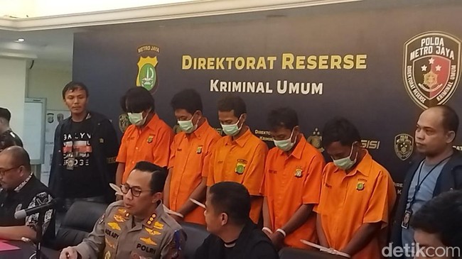 Kelima tersangka itu dihadirkan polisi dalam jumpa pers di Mapolda Metro Jaya, Jakarta, Jumat (26/7/2024). Mereka terlihat memakai baju tahanan dan tangan diborgol.