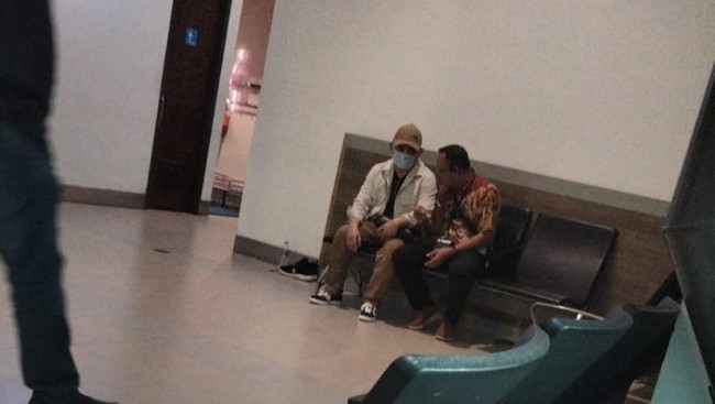 Di dalam area bandara, Ujang terlihat berdiskusi dengan petugas dari Kejagung yang mengenakan baju batik. Ujang juga dikelilingi oleh sejumlah petugas dari Kejagung.