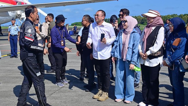 Dilihat detikcom melalui YouTube, Sekretariat Presiden, Jokowi tiba dengan mengendarai sepeda motor. Jokowi tampak mengenakan jaket hitam bertulisan 'Nusantara' dan helm.