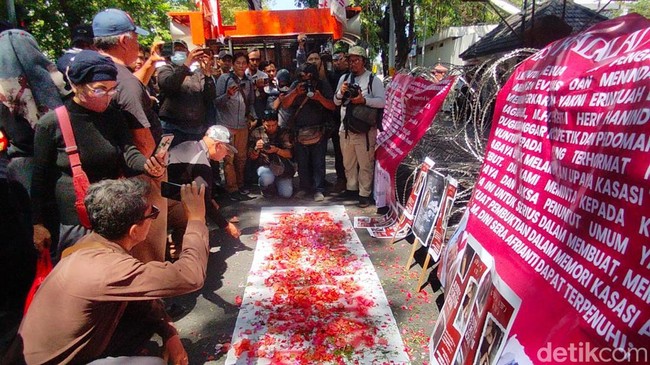Tak hanya itu, massa juga membawa poster hingga banner yang berisi tuntutan #Justicefordinisera. Mereka juga menaburkan bunga di depan PN Surabaya tanda matinya keadilan.