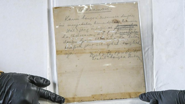 Adapun teks asli proklamasi yang ditulis Ir. Soekarno kini tersimpan di Gedung Arsip Nasional Republik Indonesia (ANRI), Jakarta Pusat sejak 1992. Berikut adalah isi teks proklamasi kemerdekaan Indonesia yang asli.