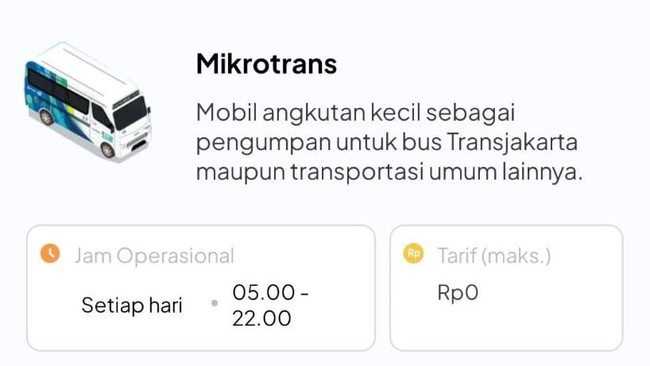 - Hari dan jam operasional, tarif maksimal, jenis transaksi, serta rute Mikrotrans akan tampil
