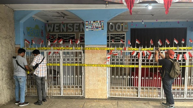 Dari foto yang diterima detikcom, Kamis (1/8), terlihat polisi memasang police line di Wensen School. Garis polisi tersebut dipasang mengitari pagar Wensen School yang juga merupakan sekolah PAUD.