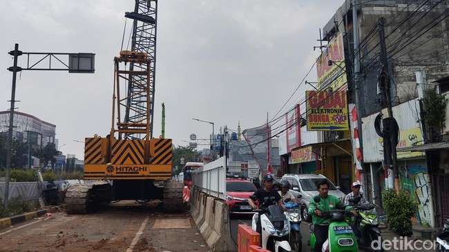 Terlihat proyek pembangunan LRT Jakarta memakan satu ruas jalan di dekat perlintasan kereta api. Ruas jalan yang awalnya memiliki dua lajur berkurang menjadi hanya satu lajur, akibatnya kendaraan yang hendak melintas harus berjalan bergantian.