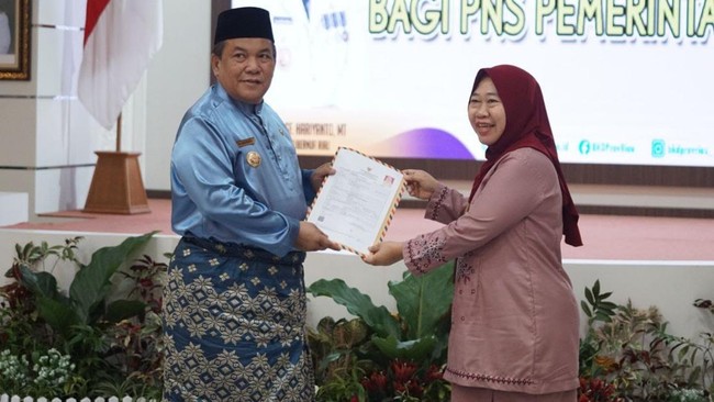 Penjabat (Pj) Gubernur Riau SF Hariyanto menyerahkan SK Pensiun bagi Pegawai Negeri Sipil (PNS) di Lingkungan Provinsi Riau. SK Pensiun diserahkan kepada 49 PNS dari 14 Organisasi Perangkat Daerah (OPD) di lingkungan Pemprov Riau dengan Terhitung Mulai Tanggal (TMT) Pensiun 1 Oktober 2024.