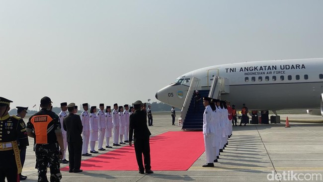 Pesawat Boeing TNI Angkatan Udara (AU) dengan nomor A-7305 sudah berada di lokasi. Tampak karpet merah juga digelar menuju pintu masuk pesawat tersebut. Paskibraka tampak dalam sikap sempurna.