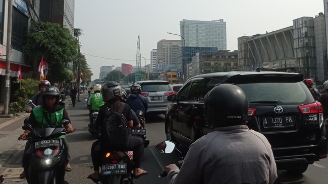 Pantauan detikcom, Selasa (29/8/2023), pukul 09.25 WIB, kemacetan terjadi di Jalan Gajah Mada arah Kota Tua. Kemacetan juga terlihat simpang Harmoni.