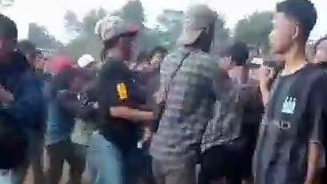 Tidak lama kemudian mereka saling baku hantam hingga beberapa di antaranya tersungkur ke tanah. Warga lain yang berusaha melerai pun kesulitan lantaran banyaknya massa yang terlibat bentrokan.