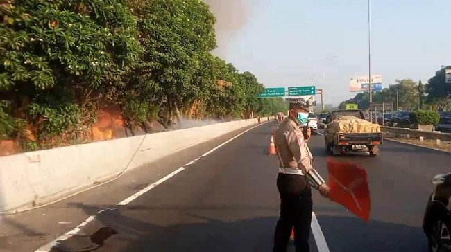 Kebakaran itu terjadi di sebuah lahan yang berada di luar jalan tol. Lahan itu berada cukup jauh dari batas jalan tol, hanya asapnya terlihat hingga tol.