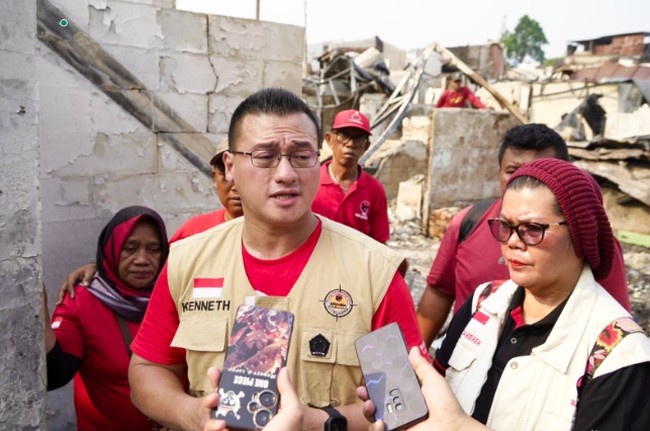 Kepala Badan Penanggulangan Bencana (Baguna) DPD PDI Perjuangan DKI Jakarta, Hardiyanto Kenneth beserta jajaran pengurus Baguna terlihat mengunjungi korban kebakaran di Jalan DR Saharjo I, Manggarai, Tebet, Jakarta Selatan, pada Kamis 15 Agustus 2024.