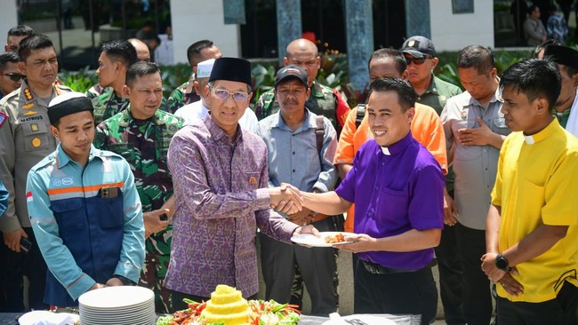 Heru memotong tumpeng dan memberikan potongan tumpeng tersebut kepada perwakilan tokoh agama, tokoh masyarakat, TNI-Polri, hingga pekerja konstruksi Ibu Kota Nusantara.