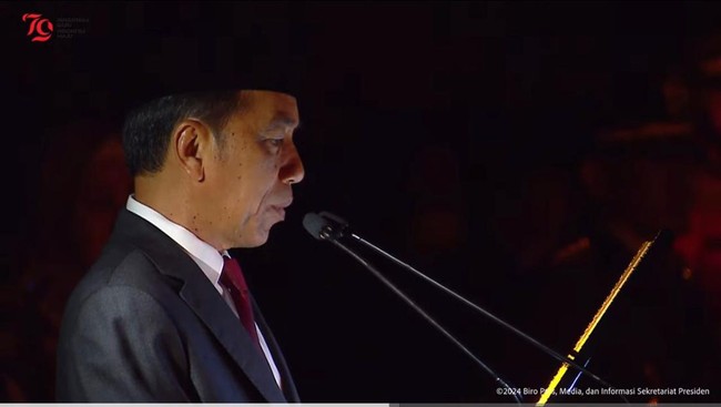 Upacara digelar mulai pukul 00.00 WITA, Jumat (16/8/2024). Jokowi tampak mengenakan jas dan peci berwarna hitam.