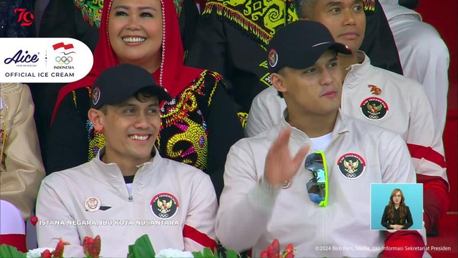 Pantauan detikcom di Istana Negara IKN, Sabtu (17/8/2024), peraih medali emas Rizki Juniansyah dan Veddriq Leonardo terlihat hadir di bagian pemimpin lembaga negara dan menteri. Rizki dan Veddriq tampak menggunakan jaket kontingen Indonesia dan membawa medali emas.