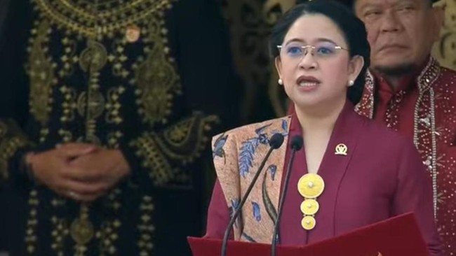 Ketua DPR RI Puan Maharani membacakan teks proklamasi dalam upacara HUT ke-79 RI di Istana Ibu Kota Nusantara (IKN). Puan tampak mengenakan kebaya merah dengan kain batik cokelat di bahu kanannya.