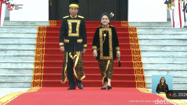 Presiden Joko Widodo (Jokowi) mengenakan pakaian adat Kustin asal Kutai, Kalimantan Timur, pada upacara HUT ke-79 RI di Ibu Kota Nusantara (IKN). Begitupun Ibu Negara Iriana Jokowi.