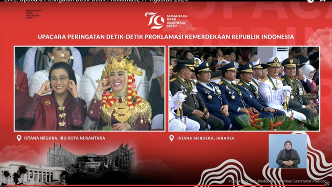 Dilihat dalam siaran langsung Sekretariat Presiden (Setpres), Sabtu (17/8/2024), tampak kolase dua tayangan live di Istana Jakarta dan Istana Negara IKN. Para tamu duduk dengan ragam pakaian adat.