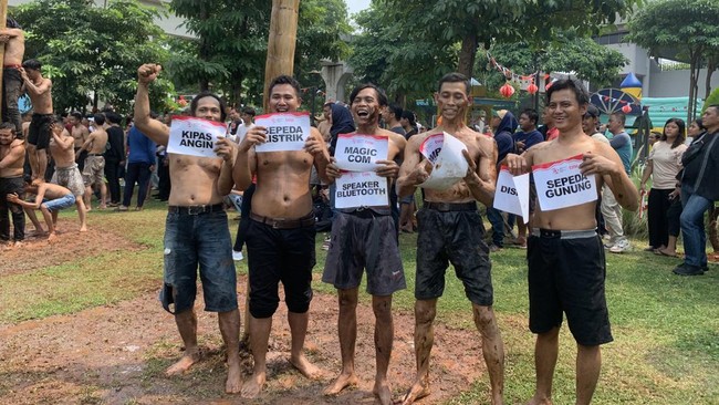 Lomba panjat pinang di Taman Mini Indah Indonesia (TMII), Jakarta Timur (Jaktim), menyedot banyak perhatian. Salah satu tim bahkan datang sejak pukul 06.00 WIB agar bisa jadi peserta lomba.