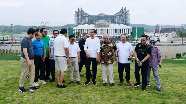 Jokowi dan rombongan melanjutkan perjalanan menuju Istana Garuda dengan menggunakan mobil golf. Istana Garuda, yang baru saja rampung, menunjukkan perpaduan arsitektur modern dengan nuansa tradisional sebagai identitas nasional yang kuat.