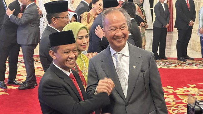 Pantauan detikcom di Istana Presiden, Senin (19/8/2024), selesai pelantikan, tampak para menteri dan wamen, serta kepala lembaga disalami sejumlah pejabat, termasuk Presiden Joko Widodo (Jokowi). Agus Gumiwang menyalami Bahlil.