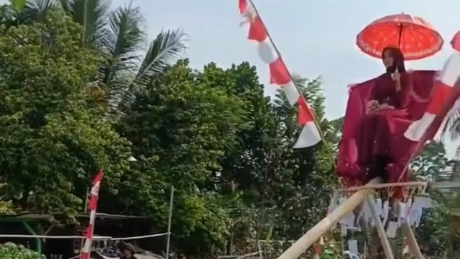 Berdasarkan video yang beredar di media sosial, tampak beberapa pria tengah memanjat tiang yang diposisikan menyerong. Di ujung tiang tersebut, terduduk seseorang yang berpenampilan perempuan dengan kerudung dan pakaian merah seraya memegang payung.