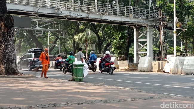 Para petugas dari kepolisian membuka barier beton yang ada yang di bawah jembatan penyeberangan orang Kemenparekraf. Petugas Dishub dan Satpol PP membuka traffic barrier yang ada di bundaran Patung Kuda.