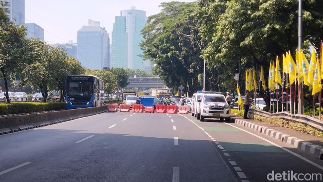 Pantauan detikcom, Kamis (22/8/2024), pukul 11.18 WIB, arus lalu lintas di Jalan Gatot Subroto arah gedung DPR/MPR dialihkan ke Jalan Gerbang Pemuda. Kondisi arus lalu lintas terpantau padat.