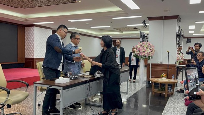 Perwakilan aktivis '98, Komi Omaria Majid, terlihat memberikan bunga kepada Fajar dan Yuliandri. Keduanya tampak menerima bunga itu.