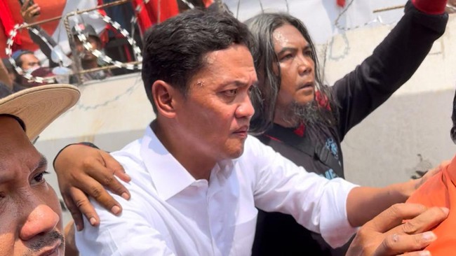 Habiburokhman menemui massa di depan DPR pada pukul 12.51 WIB, Kamis (22/8/2024). Habiburokhman keluar dari gedung bersama Ketua Baleg DPR RI Wihadi hingga Wakil Ketua Baleg DPR RI Achmad Baidowi (Awiek).