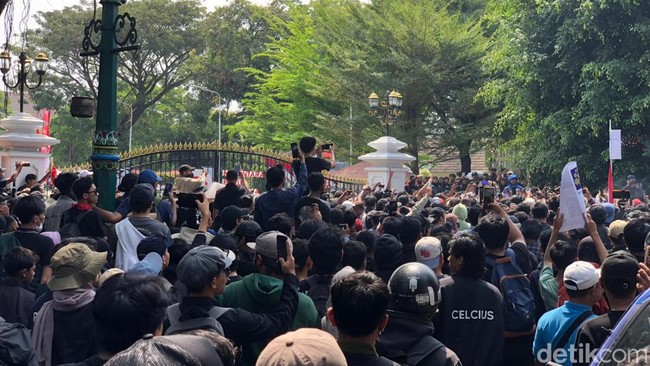 Pantauan detikJogja, massa tiba di depan Gedung Agung pada Kamis (22/8/2024) sekitar pukul 13.00 WIB
