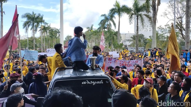 Setelah terus maju, ratusan para mahasiswa ini akhirnya bisa masuk ke depan halaman DPRD Sumsel. Perwakilan dari masing-masing universitas ini menyuarakan tuntutan mereka.
