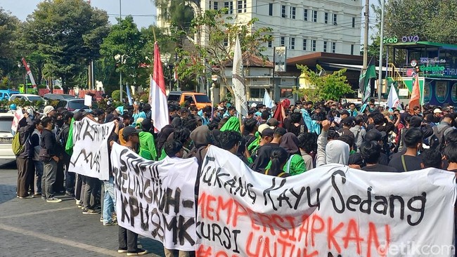 Mahasiswa membentangkan berbagai spanduk dalam aksi demo itu yang bertulisan 'Tukang Kayu Sedang Mempersiapkan Kursi untuk Anaknya', 'Koalisi Indonesia Melawan', dan sebagainya.