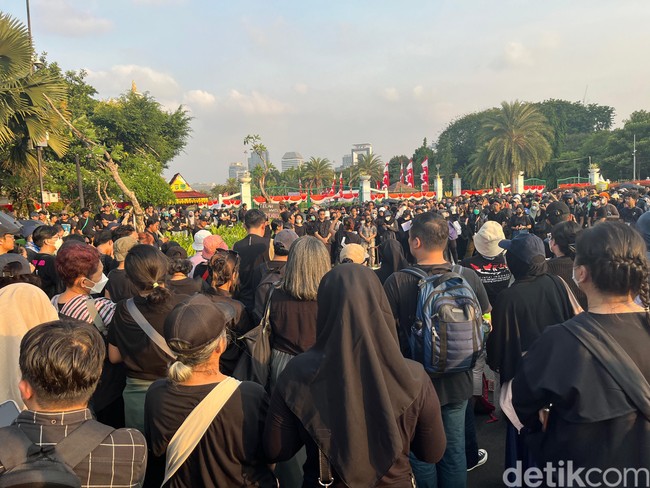 Pantauan detikcom di lokasi seberang Istana Merdeka, Kamis (22/8/2024) sore, peserta aksi Kamisan terpantau sangat ramai. Mereka tampak kompak mengenakan busana serba hitam dan membentuk lingkaran besar.
