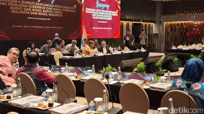 KPU RI menggelar rapat konsinyering untuk membahas 4 rancangan peraturan PKPU tentang pemilihan gubernur dan wakil gubernur, bupati dan wakil bupati serta wali kota dan wakil wali kota. Agenda rapat ini membahas soal putusan Mahkamah Konstitusi atau MK, serta rancangan perubahan Peraturan KPU atau PKPU Nomor 8 Tahun 2024.