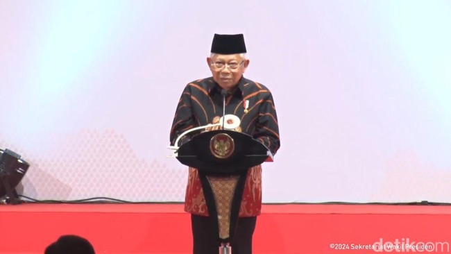 Wakil Presiden yang juga Ketua Dewan Syuro PKB Ma'ruf Amin memberikan arahan dalam penutupan Muktamar PKB ke-VI 2024 di Bali. Ma'ruf kembali mengungkit soal perumpamaan semua orang ingin jadi anak presiden.