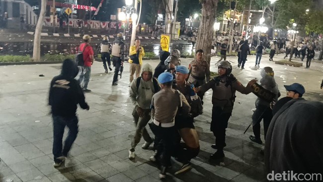 "Bisa menyaksikan sampai mana adik-adik kita melakukan pelemparan batu, paving, kayu, bambu dan seterusnya, ada beberapa korban, bahkan Wakasat Intel Polrestabes itu terkena 'tombak' di pipi kanannya," jelas Irwan.