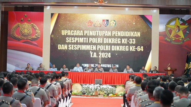 Kapolri Jenderal Listyo Sigit Prabowo menutup pendidikan Sespimti Dikreg ke-33 dan Sespimen Dikreg ke-64 tahun ajaran 2024. Sejumlah pejabat utama Mabes Polri mendampingi, termasuk Kepala Sespim Lemdiklat Polri Irjen Chrysnanda Dwilaksana.