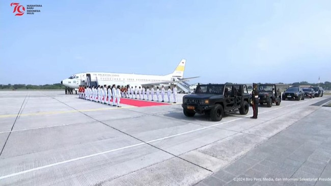 Dilihat YouTube Sekretariat Presiden, Sabtu (31/8/2024), pesawat Boeing 737-400 yang membawa bendera Merah Putih dan teks proklamasi itu tiba di Bandara Halim Perdanakusuma pukul 15.10 WIB.