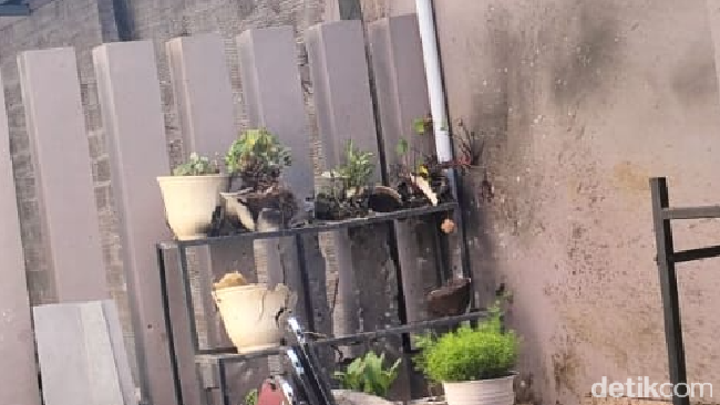 Terlihat ada bekas hitam di pot yang rusak itu. Bekas hitam juga terlihat di dinding yang ada di sekitar pot.
