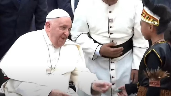Paus Fransiskus terlihat memakai kursi roda. Dia menerima bunga dari dua anak-anak asal Indonesia.
