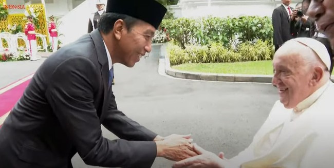 Presiden Jokowi yang berada di pintu masuk Istana Merdeka langsung menyambut kedatangan Paus Fransiskus. Jokowi terlihat menyapa dan menyalami Paus sambil tersenyum.