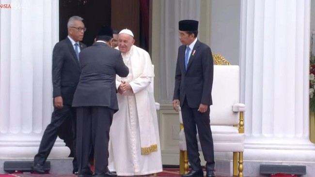 Kedatangan Pemimpin Gereja Katolik Dunia sekaligus Kepala Negara Vatikan, Paus Fransiskus, di Istana Merdeka disambut oleh upacara kenegaraan. Setelah itu, Presiden Joko Widodo (Jokowi) memperkenalkan sejumlah menteri ke Paus Fransiskus, termasuk Menteri Pertahanan Prabowo Subianto.
