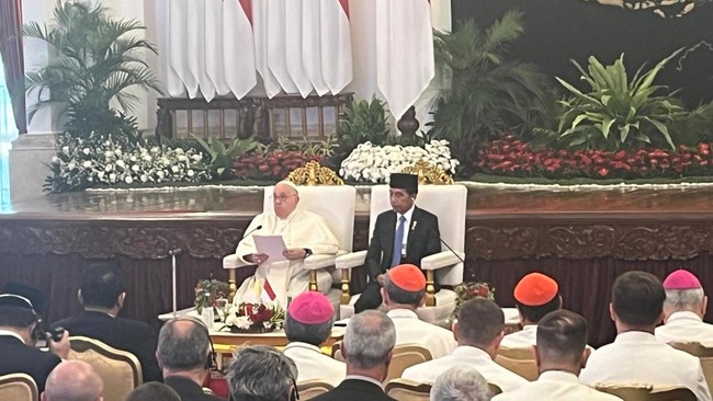 "Negara kita Indonesia menyambut gembira dan hangat kedatangan yang teramat mulia bapak suci Paus Fransiskus dan saya mendengar ini adalah penerbangan terpanjang yang Paus lakukan," kata Jokowi di Istana Negara Jakarta, Rabu (4/9/2024).