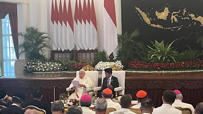 Pemimpin Gereja Katolik Dunia sekaligus Kepala Negara Vatikan, Paus Fransiskus, menyampaikan pidato di Istana Negara. Dalam pidatonya, Paus bicara soal kerukunan, kemajemukan, hingga perdamaian.