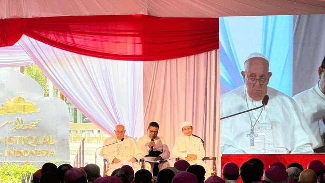 "Mengenai hal ini, haruslah disebut terowongan bawah tanah 'terowongan persahabatan' yang menghubungkan Masjid Istiqlal dan Katedral Santa Maria Diangkat ke Surga. Ini adalah simbol yang bermakna, yang memperkenankan dua tempat ibadah agung tidak hanya berada berhadapan satu sama lain, tapi terhubung satu sama lain," kata Paus Fransiskus di Masjid Istiqlal, Kamis (5/9/2024).