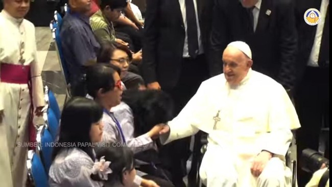 Pemimpin Gereja Katolik Paus Fransiskus menyapa sejumlah penyandang disabilitas di kantor Konferensi Waligereja Indonesia (KWI), Jakarta Pusat, hari ini. Pada pertemuan itu, Paus memberikan pesan penting kepada para penyintas.
