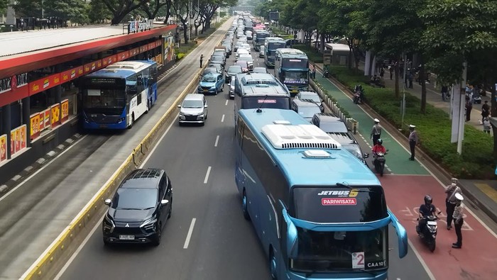 Rombongan bus peserta misa akbar Paus Fransiskus mulai berdatangan ke kawasan Stadion Utama Gelora Bung Karno, Senayan, Jakarta Pusat (Jakpus). Arus lalu lintas di Jalan Jenderal Sudirman pun mulai mengalami kemacetan.
