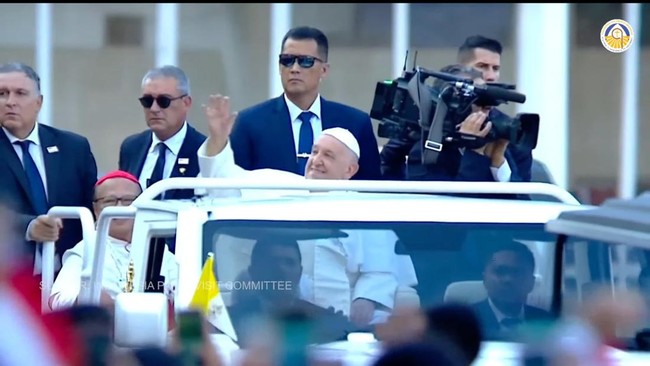 Pemimpin Gereja Katolik Dunia sekaligus Kepala Negara Vatikan, Paus Fransiskus, tiba di Gelora Bung Karno (GBK), Jakarta, untuk memimpin misa akbar. Paus naik mobil Maung buatan PT Pindad untuk menyapa umat.
